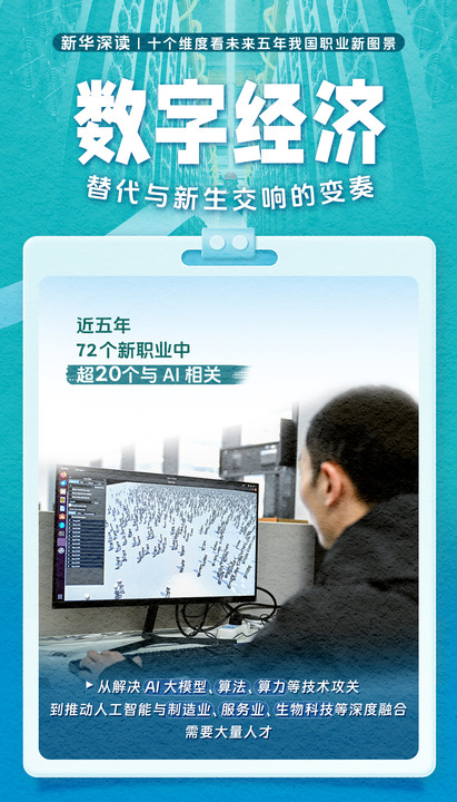 过去五年,人力资源社会保障部发布的72个新职业中,超20个与人工智能相关,预计每个新职业将在短期内带动30万至50万人就业。