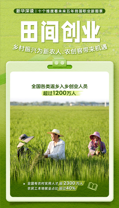 目前全国各类返乡入乡创业人员超过1200万人。越来越多青年大学生、城市白领等把握加快农业农村现代化发展机会,带着技术、资金等返乡入乡创业,涌现出农村集体经济经理人等新职业。